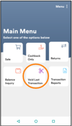 To perform a Void, start from the Main Menu and select Void Last Transaction.